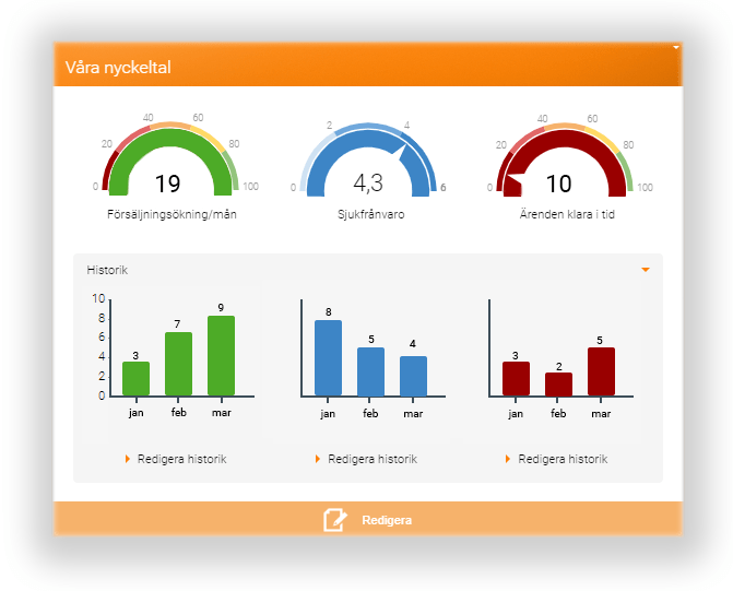 Med Nyckeltalsmätaren kan administratörer definiera positiva och negativa värden genom att välja upp till 5 olika intervall med önskade färger. Detta gör det tydligt att se nyanserna i förändringarna över tiden. En administratör kan skapa upp till 9 olika nyckeltalsmätare att presentera på startsidan. Varje mätare kan presentera specifika nyckeltal för varje avdelning exempelvis ekonomiska, finansiella eller nyckeltal inom HR. I en kontrollpanel kan du som administratör ställa in om respektive nyckeltal ska visas som heltaltsvärde eller med decimaler.